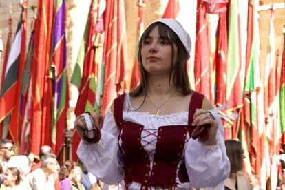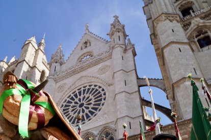 Niños y niñas bailando bajo las sayas mientras los mayores tocan la pandereta y las castañuelas, al ritmo que marca la tradición y la apuesta por conservar lo que León fue se mezclaron entre los mayores por el camino y a los pies de la Catedral después de arañar el cielo con sus coloridos y vistosos pendones.