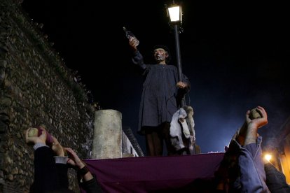 El cortejo procesional profano del santo pellejero, putero y borrachín apuesta por recuperar este Jueves Santo su esencia satírica y literaria, dentro de su recorrido original, pese a haberse convertido en un macrobotellón con 20.000 personas