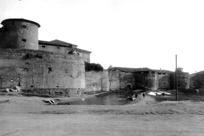 El Arco de la Cárcel y las murallas romanas, con el agua de la presa en una imagen de principios de siglo