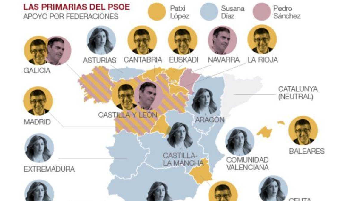 Tras su derrocamiento de octubre pasado, Sánchez ha perdido la mayoría del poder orgánico que ostentaba, hasta el punto de que ahora mismo solo tiene en el zurrón el aval de la secretaria general del PSOE de Navarra, María Chivite. Algunas federaciones que antes controlaba, como Madrid (Sara Hernández), Baleares (Francina Armengol) y La Rioja (pilotada por el exmano derecha César Luena) apuestan ahora por Patxi López. Al exlendakari le respaldan también los barones de Murcia (Rafael Martínez Tovar), Cantabria (Eva Díaz Tezanos) y, claro, Euskadi (Idoia Mendia). Los feudos de López suman unos 34.000 militantes.