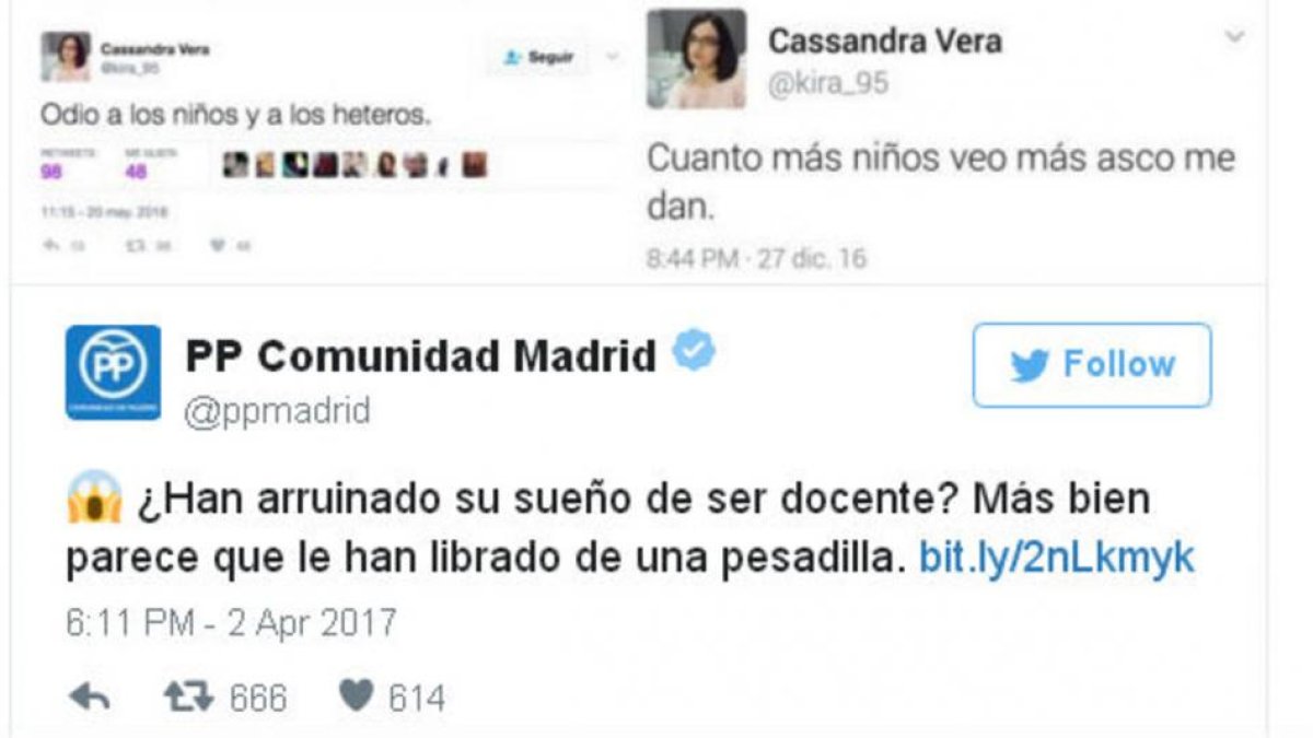 "¿Han arruinado su sueño de ser docente? Más bien parece que le han librado de una pesadilla", escribe la cuenta oficial del PP madrileño adjuntando cuatro tuits de Cassandra: "odio a los niños y a los heteros", "cuanto más niños veo más asco me dan", "¿me gustan los niños pequeños? NO" y "cómo se me ocurre a trabajos de niñera con lo que odio a los niños".