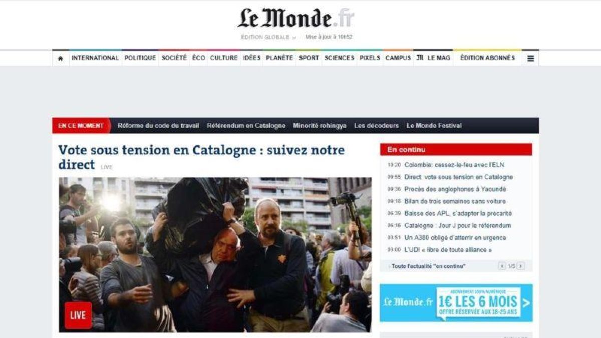 También Le Monde, que subraya la tensión de la jornada y la contundencia de la policía en una "votación de autodeterminación prohibida por Madrid".