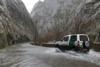 La carretera de las Hoces de Vegacervera, inundada este lunes. RAMIRO