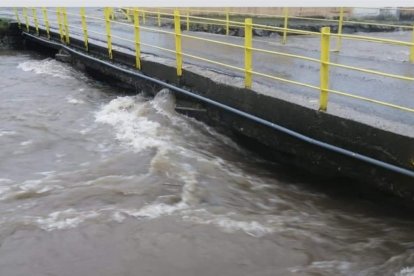 Las aguas casi desbordan el puente de Ventosilla en Villamanín. DL