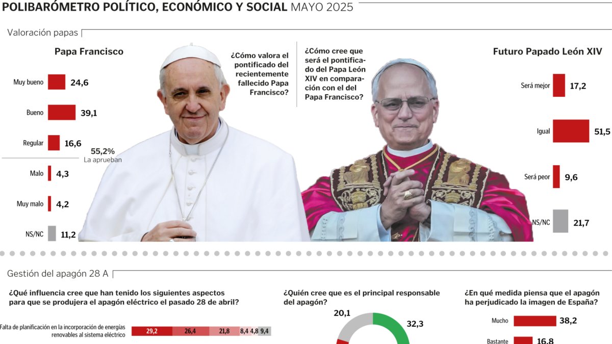 La encuesta coincidió con la muerte del papa Francisco y la elección del cardenal Prevost como León XIV. La valoración del pontificado de Francisco ha sido buena o muy buena para el 63,5 % de los encuestados, un saldo a su favor muy elevado ya que sólo un 8,5 % condena sus decisiones al frente de la Iglesia. Más de la mitad de los encuestados confía en el nuevo Papa. El 51,5 % cree que el pontificado de León XIV será mejor (17, 2 %) o igual de bueno (51,5 %) que el de Francisco y sólo un 9,6 % que será peor el de Prevost que el de Bergoglio.