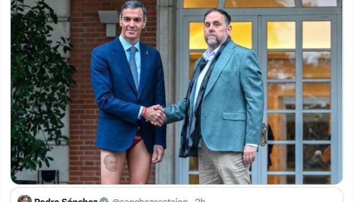 Nuevas Generaciones (NNGG), la organización juvenil del PP, ha difundido este jueves en la red social X una imagen de inteligencia artificial del presidente del Gobierno, Pedro Sánchez, sin pantalones ante el líder de Esquerra Republicana (ERC), Oriol Junqueras.