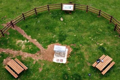 Otra de las obras que se han realizado esta primavera es el Mirador de la Valleja. Se trata de un recinto circular, cercado con troncos de madera, que alberga en su interior una fuente, dos mesas con bancos incorporados y una señal panorámica que hace alusión al territorio que desde allí se observa y recoge información de cuatro de los árboles autóctonos más significativos: el acebo, el tejo, el roble y el haya.