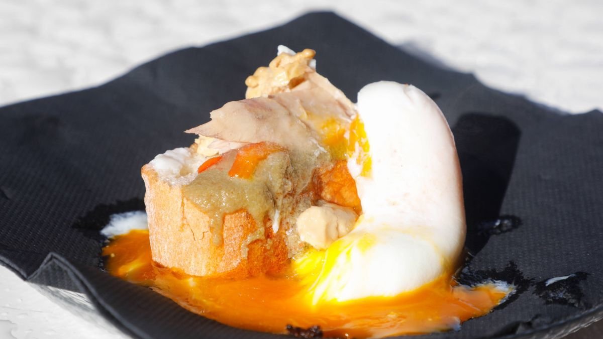 La tapa es un montaje sencillo de entender y muy disfrutable: una rebanada de pan tostado como base crujiente, una crema tipo mayonesa de aguacate con tomate y lima que aporta frescura, pimientos asados para sumar dulzor, y encima dos capas con personalidad: foie de pato y bonito en aceite de oliva, jugando con la untuosidad y el punto marino. Se corona con un huevo poché, para que al romper la yema se forme una salsa natural que lo une todo. El remate lo ponen unos puntos de salsa picante y un toque de vinagre, sal y pimienta negra, para equilibrar y dejar un final con carácter.