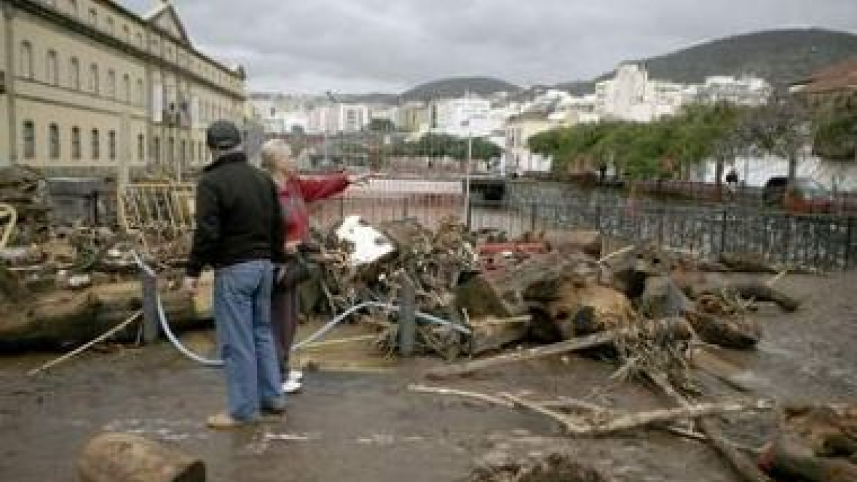 Tenerife, la isla más afectada por la tromba de agua que el lunes descargó en Canarias, amaneció ayer cubierta de barro, con cientos de casas, garajes y tiendas anegadas por el lodo, vecinos incomunicados y carreteras cortadas. A causa de las fuertes lluvias, se procedió al desalojo de 41 personas; 20 en El Rosario (en Tabaiba baja) y 21 en Santa Cruz de Tenerife. En la imagen de la izquierda se observa un camión de recogida de basura atrapado en uno de los boquetes que las fuertes lluvias caídas en la capital tinerfeña han ocasionado en una calle. En la derecha dos vecinos de Tenerife observan los restos de troncos y palos arrastrados a la zona baja de la ciudad tras las fuertes lluvias. | efe