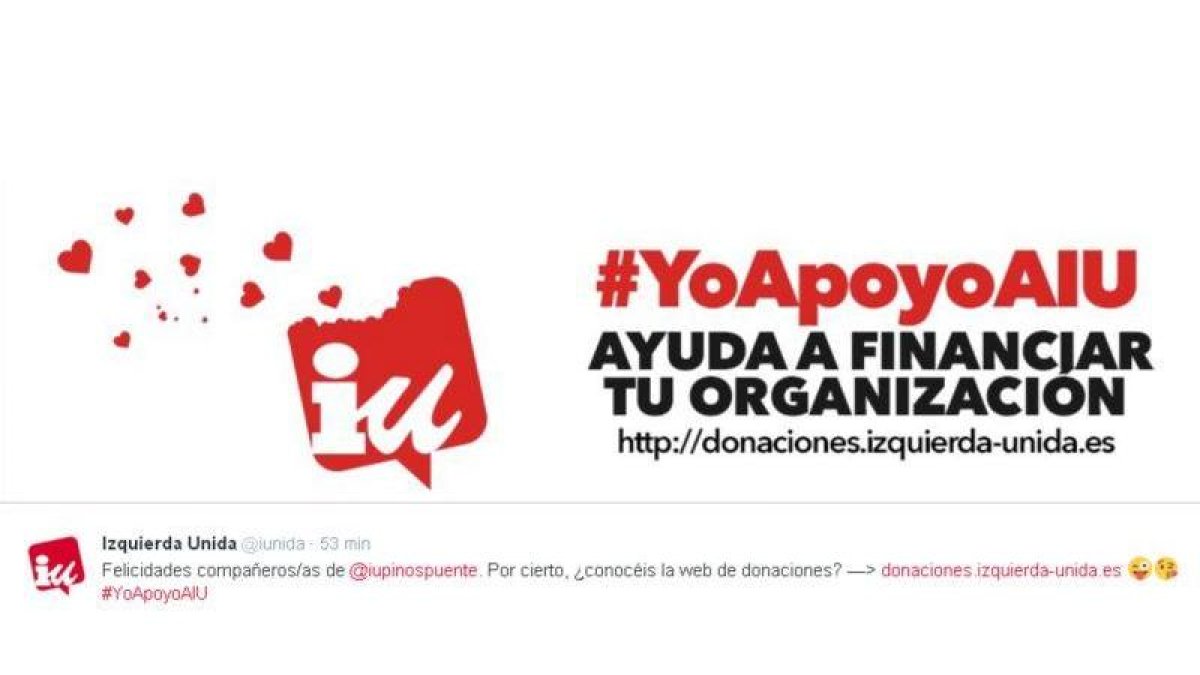 Izquierda Unida no ha perdido este jueves la ocasión para felicitar a sus compañeros del Partido Comunista de la localidad granadina de Pinos Puente tras haberles tocado el segundo premio de la Lotería de Navidad. También ha aprovechado la buena nueva para recordarles, así como quien no quiere la cosa y en tono de broma, que tienen a su disposición una web para hacer donaciones al partido.
