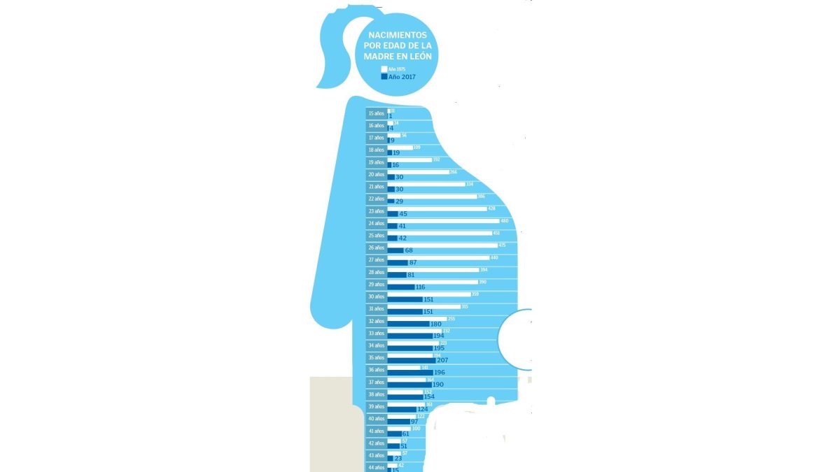 En España ya es más frecuente que una mujer tenga un hijo, sea o no el primero, a los 40 años que a los 25. En 2017, nacieron 9.244 niños de madres de 25 años y 12.993 con madres de 40 años. En el año 2010 todavía ocurría al revés pero desde hace 4 años (2014) ya son , además, más numerosas las madres de 40 a 44 años que de 20 a 25 y las de 35 a 39 casi doblan a las de 25 a 29. Y todo sucede en un contexto de bajada general de la natalidad. El grueso de nacimientos que se producen en León son de mujeres de 35 años —207— una edad que se aleja 11 años de la que lideraba la maternidad en 1975, cuando las madres de 24 años dieron a luz a 480 niños y niñas en esta provincia.