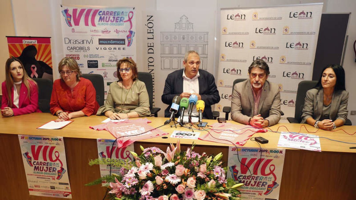 El concejal de Deportes, Vicente Canuria, la concejala de Igualdad, Argelia Cabado, y la presidenta de Almon, Ana Isabel González, presentaron ayer la séptima edición de la Carrera de la Mujer Almon-Drasanvi Contra el Cáncer de Mama que se celebra el domingo 27 de octubre en León y que confía en igualar las cifras de 2018, con 7.200 participantes y 26.500 euros para la lucha contra esta enfermedad.