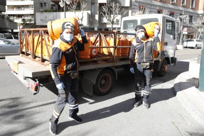 José Delgado e Iván Rubio, dos trabajadores esenciales, reparten bombonas de butano en Gran Vía de San Marcos durante el confinamiento de 2020