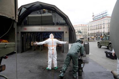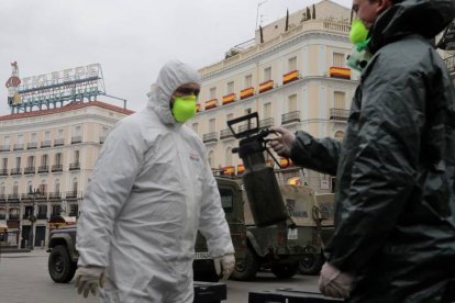 La UME desinfecta la madrileña Puerta del Sol durante el confinamiento por covid en 2020