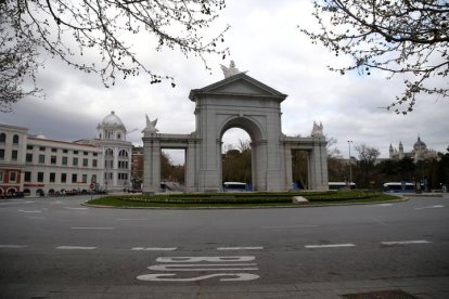 Vista de la Puerta de San Vicente, en Madrid, sin tráfico por el estado de alarma en 2020