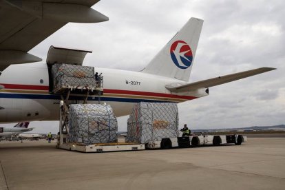 Descarga en el aeropuerto de Zaragoza del avión procedente de China con las primeras seis toneladas de material de protección en 2020