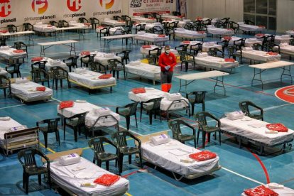 Miembros de la Cruz Roja instalan material en el pabellón de Les Comas de Igualada, hospital de campaña durante el confinamiento de 2020