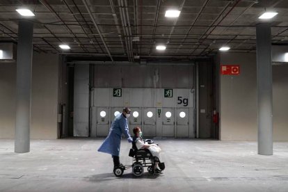 Personal sanitario traslada a una paciente en el hospital de campaña de Ifema, en Madrid