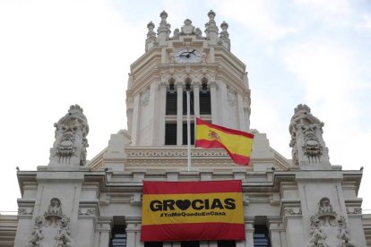 Vista de la bandera de apoyo y ánimo a los ciudadanos en la sede del ayuntamiento de Madrid en la plaza de Cibeles