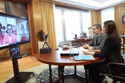 Los reyes conversando por videoconferencia desde el Palacio de la Zarzuela con responsables operativos de la Cruz Roja durante el confinamiento de 2020