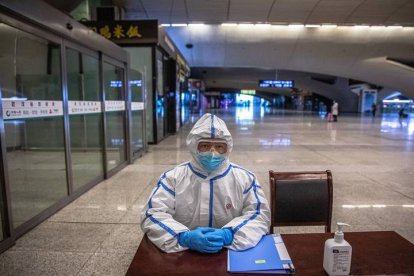 Un operario de trenes ataviado con un traje protector espera la llegada de viajeros en la estación de Wuhan, China durante la pandemia en 2020