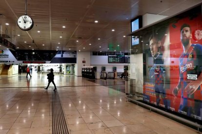 Una pasajera camina por el vestíbulo de la estación de Sants, en Barcelona desierta por el confinamiento en 2020