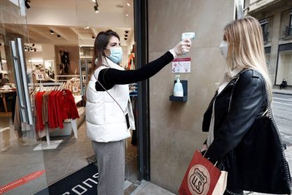 Una empleada toma la temperatura a una de las trabajadoras antes de entrar a la tienda en Navarra durante una de las fases de la desescalada en 2020