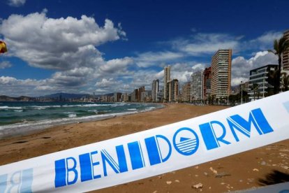 Cintas que impedían el paso a la playa de Levante en Benidorm por el confinamiento en 2020