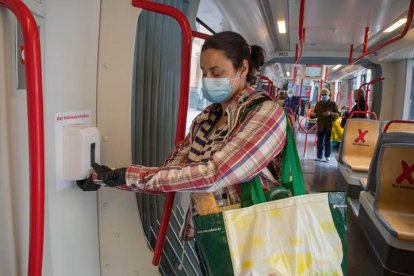 Una viajera utiliza este jueves uno de los dispensadores de gel hidroalcohólico en el transporte público de Zaragoza en 2020