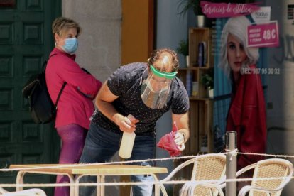 Un hostelero limpia una mesa de una terraza en El Bierzo durante la fase 1 de la desescalada del confinamiento en 2020
