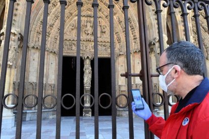 Un hombre toma una fotografía con su teléfono móvil del pórtico principal de la Catedral de León en 2020