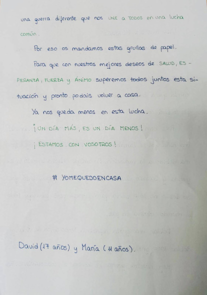 Carta enviada por David y María a los sanitarios acompañada de bizcochos durante el confinamiento de 2020