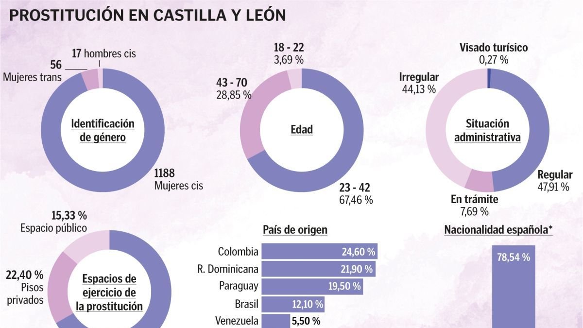 La mayoría de las personas que ejercen la prostitución y fueron atendidas en 2024 por esta asociación proceden del extranjero y no tienen nacionalidad española. En concreto, solo el 21,3% tiene nacionalidad española, aunque solo el 2,40% es de origen español. Las personas que ejercen la prostitución en Castilla y León son en su mayoría de origen colombiano (24,60%), seguido de la República Dominicana (21,90%), Paraguay (19,50%), Brasil (12,10%), Venezuela (5,50%), España (2,40%) y otros (14%).