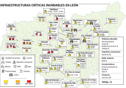 En la provincia de León, existen un total de 71 infraestructuras críticas en riesgo en la lámina de inundación con recurrencia de 500 años concentradas en 41 municipios. Son edificios e instalaciones de servicios en los que se aloja población vulnerable, como infancia, mayores o turistas; instalaciones energéticas y de depuración de aguas; industrias, carreteras y seguridad ciudadana como un cuartel de la Guardia Civil, según los datos del informe sobre infraestructuras críticas inundables de España que ha publicado el Observatorio de la Sostenibilidad.