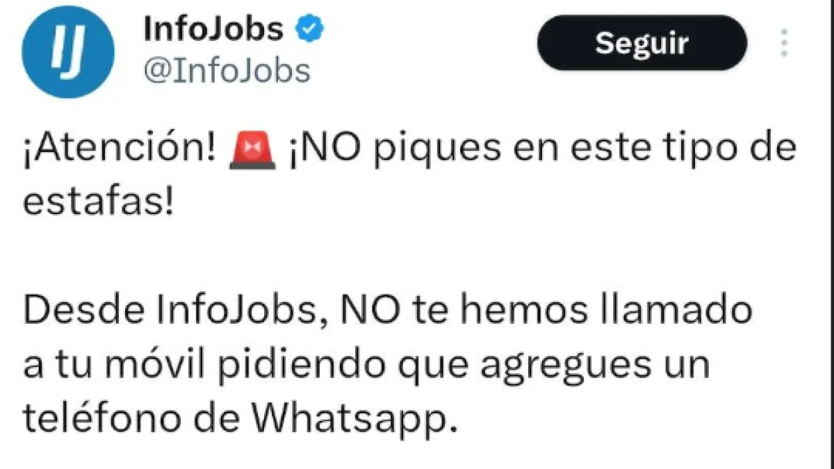El portal de empleo de InfoJobs ha confirmado a través de X (anteriormente Twitter), que se está suplantando su identidad con una nueva modalidad de fraude que busca enganchar a personas en búsqueda activa de trabajo.