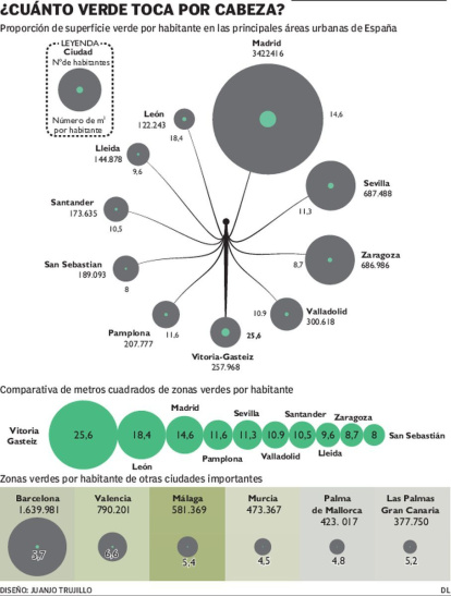 El director creativo de la revista internacional OTWO Magazine, Juan José Trujillo y su equipo preparan la publicación de un libro, Dátame, sobre visualización de datos y elaboración de infografías para comprobar el estado de parámetros como las zonas verdes, movilidad y medio ambiente en Andalucía. En el análisis de los datos, Trujillo se encontró que la ciudad de León es la segunda con más zonas verdes por habitante. «Ninguna ciudad grande e importante tiene un mínimo de habitabilidad para sus habitantes». León aparece como la segunda que más metros cuadrados por habitante tiene destinados a espacios verdes, por detras de Vitoria-Gasteiz. «En el contexto español, las diferencias son notables. Vitoria-Gasteiz y León, con más de 17 m² de parques por habitante, se sitúan a la cabeza de la sostenibilidad urbana, mientras que las grandes urbes costeras —Barcelona, Valencia o Málaga— se enfrentan al reto de equilibrar densidad poblacional y espacios naturales. Lo que hemos detectado es que prácticamente no hay ciudades que hagan lo posible por mejorar esta proporción, salvo León y Vitoria». La conclusión de este analizador de datos es que la superficie de zona verde de una ciudad es el único indicador fiable para evaluar la habitabilidad de las ciudades «por mucho que nos digan que el indicador es que todo esté abarcable a 15 minutos, que es más un indicador productivo».