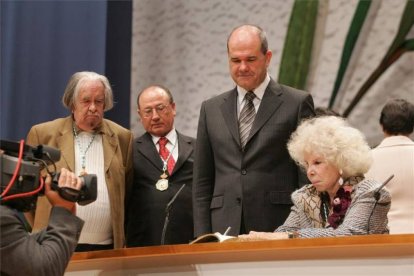 La duquesa de Alba, después de recibir la Medalla al Mérito en las Bellas Artes 2009 de mano de Felipe y Leticia, entonces príncipes de Asturias, en el Museo de la Atalaya de Jerez de la Frontera (Cádiz). JOSÉ MANUEL VIDAL | EFE